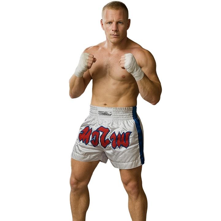Kick-/Thaiboxing Shorts aus qualitativ hochwertigem edlem Satin. Hervorragende Verarbeitung (hand made). Weisse Hose mit rotem Schriftzug auf der Vorderseite und rot / blauen Seitenstreifen. Mit breitem elastischen Bund und seitlichen Schlitzen für perfekten Tragekomfort. Schnürung in der Innenseite. Spezieller Schnitt für High-Kicks und Kniestösse.